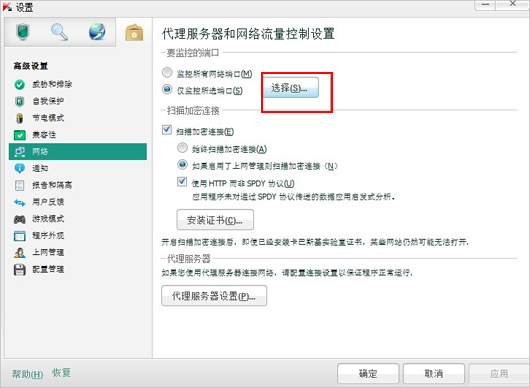 b、如果电脑上安装了卡巴斯基2013安全部队,请打开卡巴斯基的设置界面,选择高级设置=》网络=》代理服务器和网络流量控制设置=》选择仅监控所选端口,点击“选择”按钮: