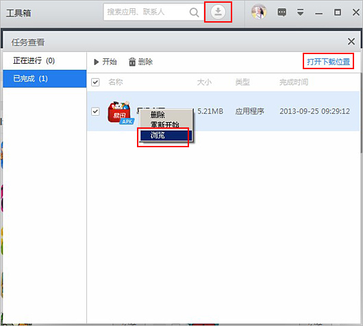 1、查看下载资源在电脑上的存放位置:点击应用宝上方导航栏里的“任务栏”=》“打开下载位置”或右键选择“浏览”即能查看下载的资源位置。