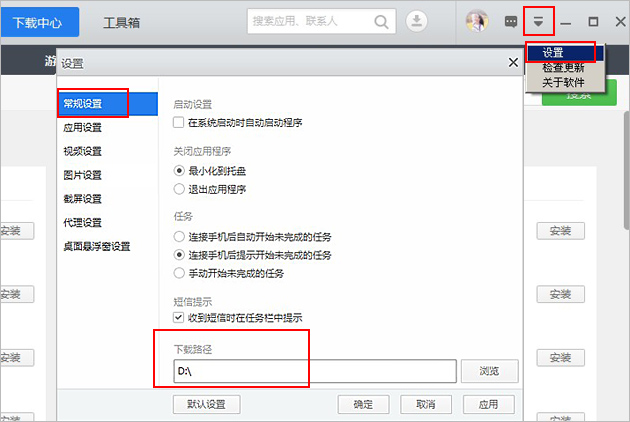 2、修改下载位置:请点击应用宝右上角“设置”,选择“常规设置=》下载路径”,选择“浏览”按钮,即可以将建立新的保存地址。