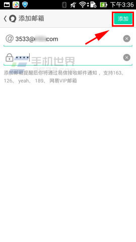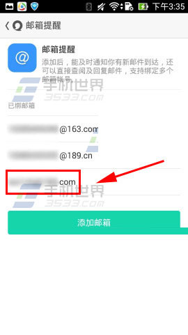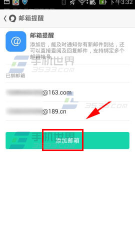 3)输入邮箱帐号跟密码点击【添加】,返回邮箱提醒可见添加的邮箱。(如下图)