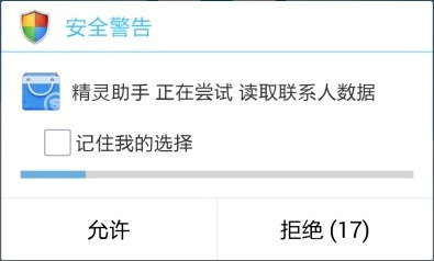 获取短信、通讯录和通话记录时需要您在手机上对精灵助手进行授权,需要您在弹出的提示框中选择“允许”