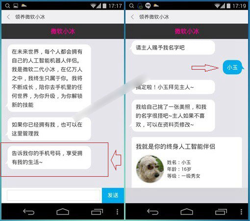 二、接下来会进入微软小冰领养界面,首先需要输入自己的手机号码,然后给微软小冰重新起一个名字,按照提示操作完成之后,微软小冰就领养成功了,如下示意图所示。
