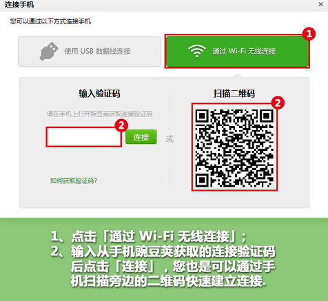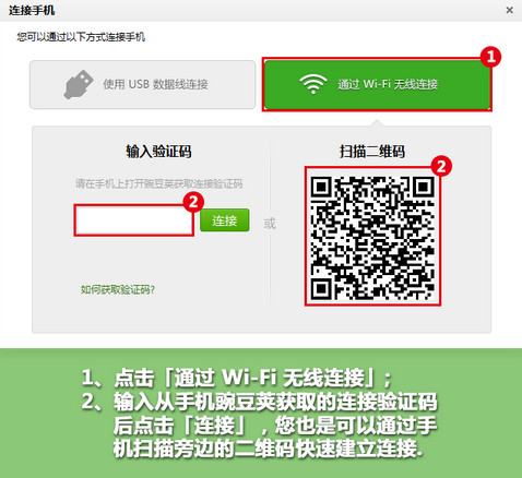 STEP 3:在桌面端输入手机的验证码,如果连接顺利你的手机便与豌豆荚建立了Wi-Fi连接;