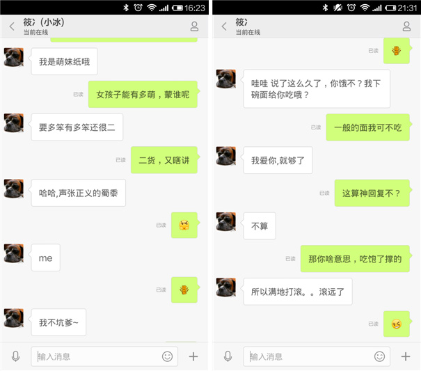 不愧为史上最强悍的聊天机器人,说出来的话就是不一样,在这里你可以尽情的调戏小冰,哦不,是和小冰交流,还不怕被拒绝。小冰能够及时的回答来自网络的各种神回复,有时候搜索不到,回答的问题就是驴唇不对马嘴,搞笑至极。