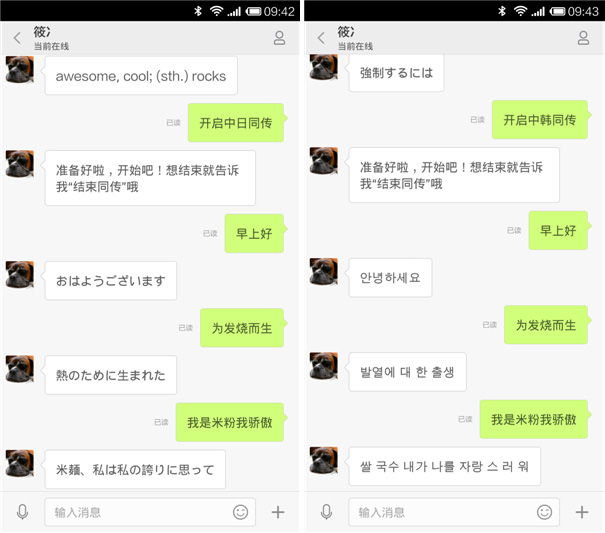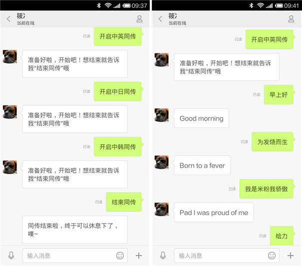 因为受到之前多种因素的限制,许多人认为小冰只会逗乐聊天,只会插科打诨的忽悠用户。这次在米聊上,小冰的许多实用技能也得以发挥。特别需要提到的就是“冰同传”技能,这一技能类似文字版的同声传译,只要加入小冰,开启“冰同传”功能,就能实现中英文的文字互译。目前小冰可以实现中英、中日、中韩的互译。是不是很强大啊,遇到欧美帅哥、长腿欧巴再也不怕了,我也能主动出击,应付自如了。