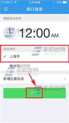 2)点击【时钟】弹出窗口选择送达时间,点击【确定】,然后点击选择【送达地址】或者【新增位置】,点击【确定】。(如下图)。