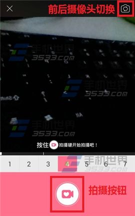 1)打开美颜相机,点击【视频自拍】,在拍摄页面,右上角有前后摄像头的【切换按钮】,下方正中间是【拍摄按钮】,按住开始拍摄,最少需要拍摄3秒。(如下图)
