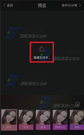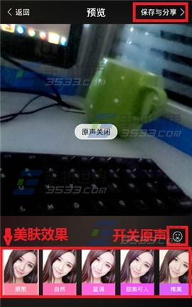 2)松开【拍摄按钮】完成拍摄,此时在屏幕左、右下角分别是【返回】和【确定】,觉得拍得不好需要重新拍摄就点击【返回】,如果需要继续就点击【确定】,点击确定后,可对视频进行操作,下方一排是美肤的效果,看你自己喜欢哪个。右下方有个原声开关按钮。编辑好之后点击右上方的保存与分享按钮即可。(如下图)
