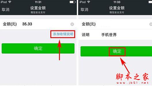 3、输入金额(最高支持500元),可以点击【添加收钱说明】进行文字说明,设置好后点击【确定】。