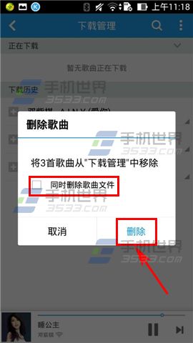 2)点击【清楚下载历史】,弹出一个【删除歌曲】的方框,如果亲们连歌曲的文件都不要的话就在【同时删除歌曲文件】前面的小空格里打上【√】,如果要保存歌曲文件的话就不要打【√】直接点击右下方【删除】即可。(如下图)