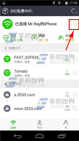1)下载并打开【360免费wifi】,进入界面后点击连接好Wifi后面的白色按键。(如下图)