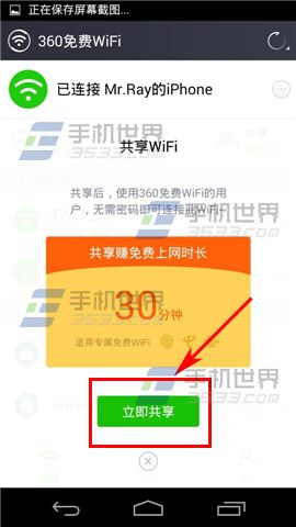 2)界面跳转后点击【共享Wifi】,然后点击【立即分享】就能赚到30分钟的Wifi了哦。(如下图)