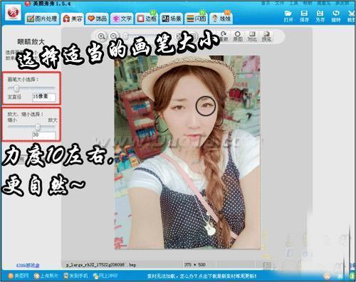 1.打开要处理的照片,选择“美容”菜单下的“眼睛放大”功能。画笔力度不要太大,否则就不自然喽!