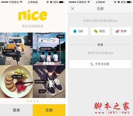 《nice》是一款集拍摄、修图、分享、社交于一身的应用,和Instagram十分类似。使用《nice》需要注册,可通过QQ、微信、微博或者手机号码进行登录,既然它最主要的功能是为照片加上标注,怎么能少的了拍摄和后期呢?