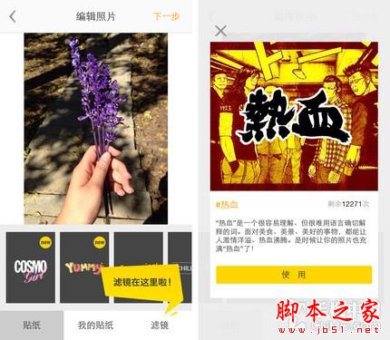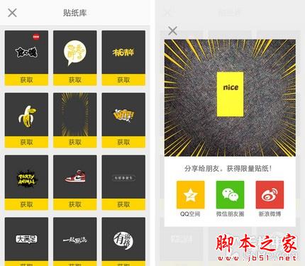 《nice》中提供了多种贴纸和滤镜效果,可调整贴纸的位置及大小,但每次仅能添加一款。虽然自带贴纸数量不多,贴纸库中却包含了其它种类和风格的装饰,不过需要将它分享给朋友们才能获取。