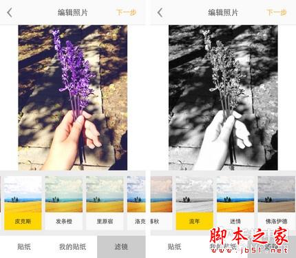 光有贴纸还不够个性,滤镜效果也是改变图片风格的必要手段,《nice》中自带13种滤镜,每一款都有一个文艺清新的名字,这最后一步就是为拍摄完成的图片加上文字标签了。