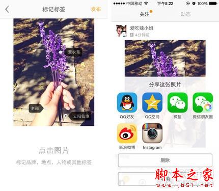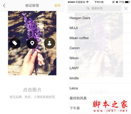轻击图片中需要说明的区域,选择标签种类,应用同时提供添加地点和人物标记,可从标签列表中选择也可自行编辑,长按标签可实现翻转,把生活中的那些点滴美好都加在图片中吧。《nice》拥有自己的分享社区,它也支持其它社交平台,包括QQ、微信、微博和Instagram。《nice》具备社交属性,若您对他的图片感兴趣,不妨去点个赞。