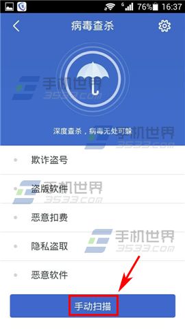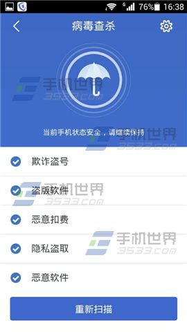 3)点击下方【手动扫描】应用就会开始进行病毒查杀,所幸小编的手机是安全的。(如下图)