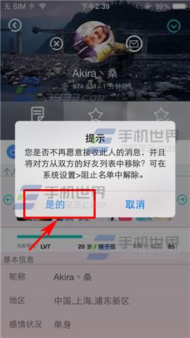 2)在好友个人资料右上方点击【∨】,弹出窗口点击【拒收消息】,再点击【是的】即可拒收消息。(如下图)
