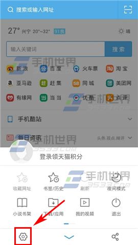 1)打开UC浏览器,点击下方正中间的【三】,然后点击【齿轮标志】。(如下图)