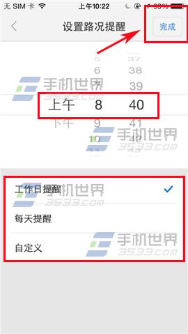3)点击【路况提醒时间】,选择你要什么时间段提醒,最后点击【完成】。(如下图)
