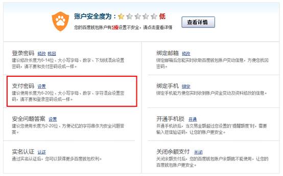 方法二:登陆百度钱包个人账号->安全中心->安全信息->支付密码设置->验证邮箱->填写页面信息->确定完成补全。