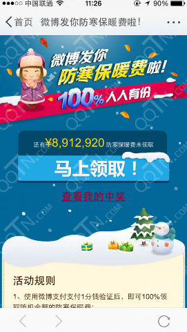 新浪微博发你防寒保暖费啦!人人有份,人人都可以领取防寒保暖费,使用微博支付支付1分钱验证后,即可100%领取随机金额的防寒保暖费,而且支付1分钱会退回小伙伴们的账户中,相当于是免费赠送给大家的现金,现金金额不等,就靠大家运气如何啦!