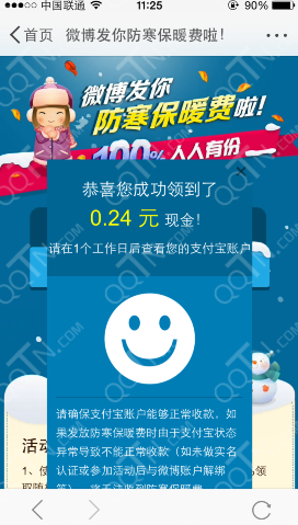 3、请确保支付宝账户能够正常收款,如果发放防寒保暖费时由于支付宝状态异常导致不能正常收款(如未做实名认证或参加活动后与微博账户解绑等),领取的防寒保暖费将发放失败;