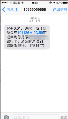 这个是小编支付以后系统所发来的短信,1分钱也会退款,小编也是醉了!
