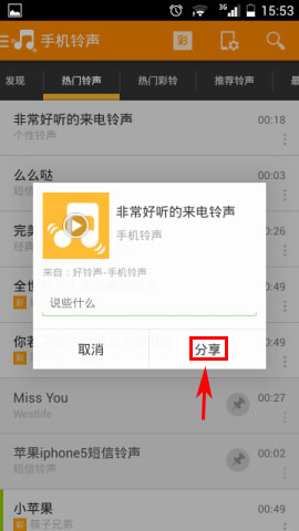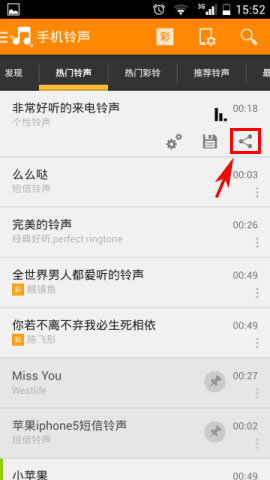 2)然后选择自己喜欢的铃声点击一下,接着就点击【分享符号】。(如下图)