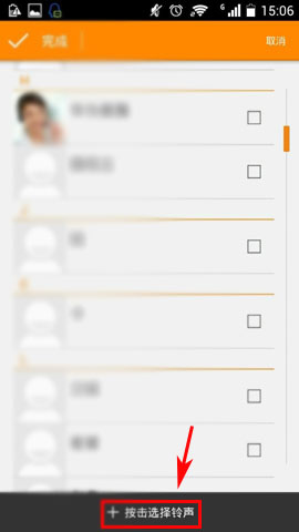 2)然后进去点击【联系人铃声】,就可以看到一个联系人页面点击【按击选择铃声】。(如下图)