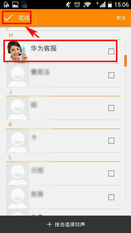 3)接着选择铃声点击【确定】,最后选择联系人点击左上角【完成】。(如下图)