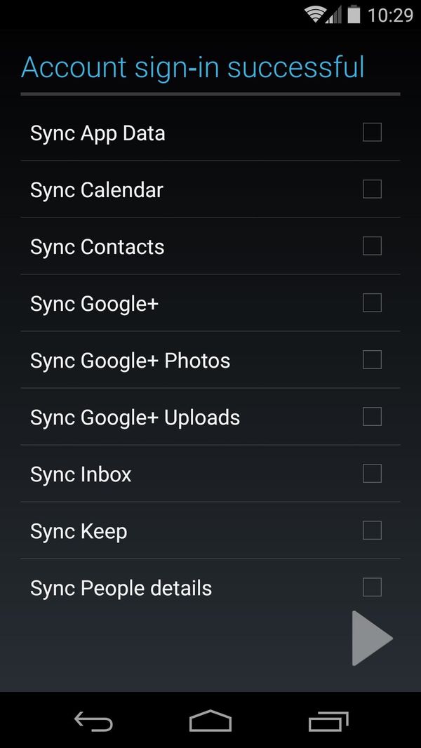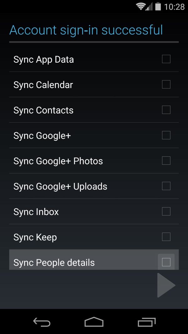 在帐号设置进程结束的时候,获得配置同步选项的机会。如果你不想要好友的帐号在设备上同步,那么记得取消所有的同步选项。