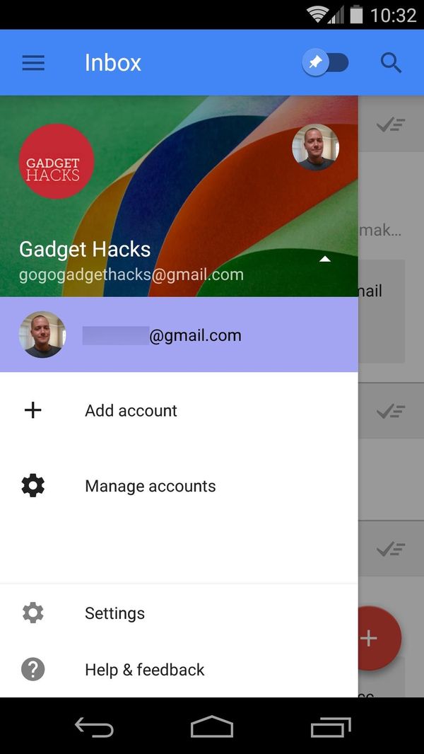 在Inbox的主界面,呼出侧面的导航模块,然后点击你的帐号名称。此时将会列出绑定到当前设备的谷歌帐号,所以此时你可以点击好友的帐号。