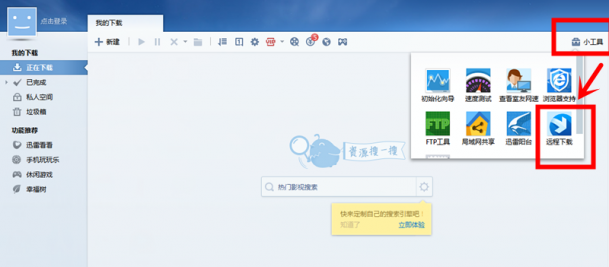 1.在电脑上安装迅雷7,打开迅雷7,点击右上角“小工具”,选择“远程下载”。