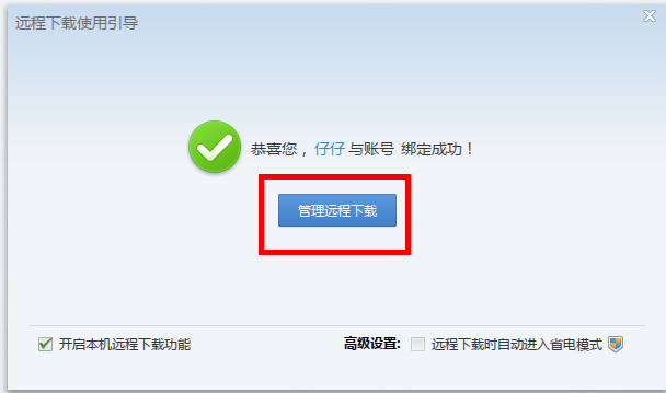 绑定成功之后,选择管理远程下载(如果本机也要远程下载,记得将左下角勾选哦