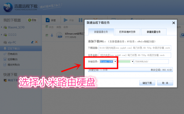 迅雷链接地址复制进去之后,一定要在左下角选择下载位置为你的小米路由器1T硬盘,否则会下载到电脑硬盘里,如图: