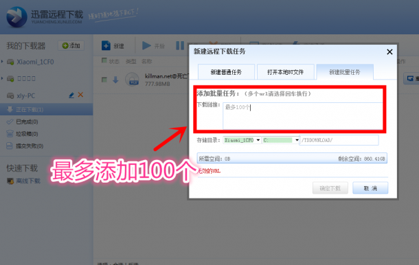 5.进入迅雷7远程下载界面,点击左侧”新建“,在出现的对话框里将你复制的地址粘贴到里面,然后将对话框左下方的存储目录选择为你的小米路由器自带1T硬盘即可开始下载了(这个和我们平时在迅雷里添加地址下载类似,唯一不同的是这个必须在远程界面新建下载,而且一定要选择好存储位置哦,否则会下载到你的电脑里