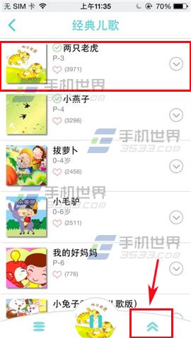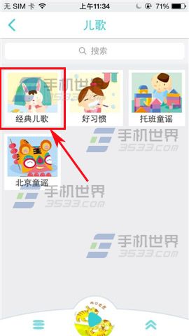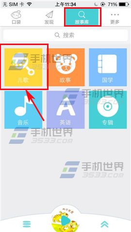 1)首先大家口袋故事听听软件,点击【故事库】,选择要听的类型(例:儿歌),进入界面选择歌曲类型。(如下图)