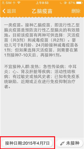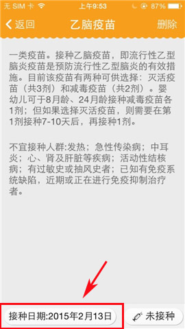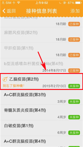1)首先打开亲宝宝,点击【疫苗接种】,进入界面选择还未接种的疫苗点击进入。(如下图)