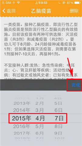 2)在左下方点击【接种日期】,弹出窗口选择日期,点击【完成】。(如下图)