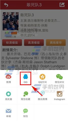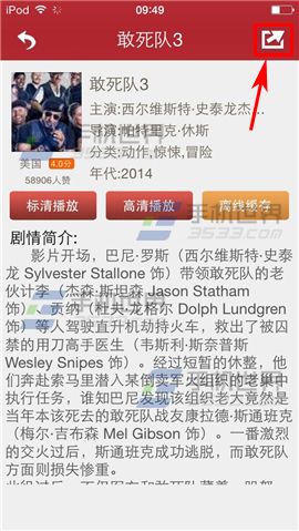 1)打开吉吉影音手机版,选择自己想要分享的视频,小编以【敢死队3】为例,点击进入,然后点击右上角【分享按钮】。(如下图)