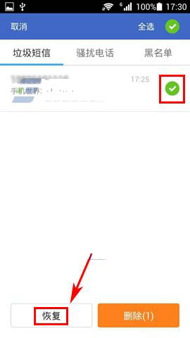 2)长按已拦截的短信,进入选择界面,勾选需要恢复的短信,点击左下角【恢复】即可。(如下图)