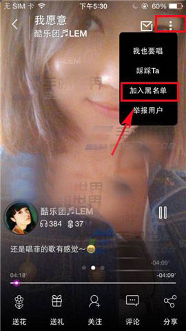 1)首先打开移动练歌房,选择拉入黑名单的好友点击进入,在右上方点击【三点】,弹出窗口点击【加入黑名单】即可加入。(如下图)