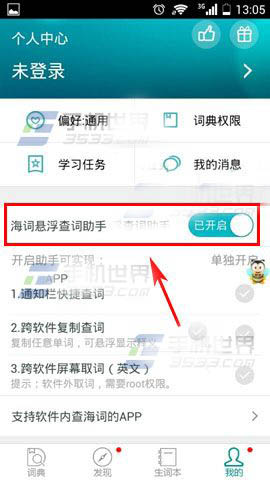 2)最后把【海词悬浮查词助手】打开就可以了。(如下图)