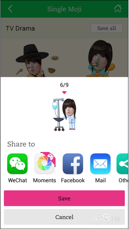 选择喜欢的表情后,此时会弹出一个新页面,然后点击微信图标,如果想分享到微信,那么可以点击Save进行保存,点击Cancel可以取消保存。