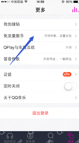 1、进入手机QQ音乐,在更多选项里点击免流量服务;