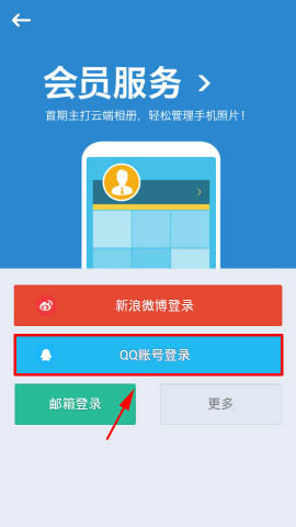 2)点击登录帐号,我们可能用新浪微博或QQ号码、手机号、QQ邮箱绑定相机360云相册,下面小编以QQ账号示范一下。(如下图所示)