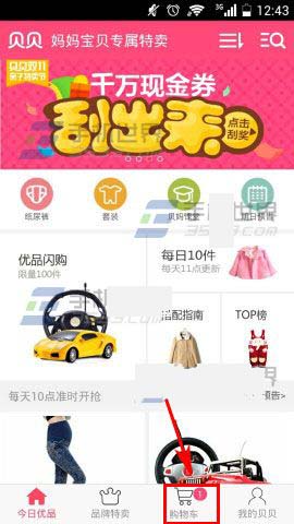 1)首先先打开【贝贝优品】,进去之后点击【购物车】。(如下图)