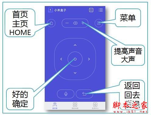 常见的选择键、确定键、菜单键、主页键、返回键、音量键。下方是功能选择栏。右上方分别是切换手势遥控器和更多设置按钮。